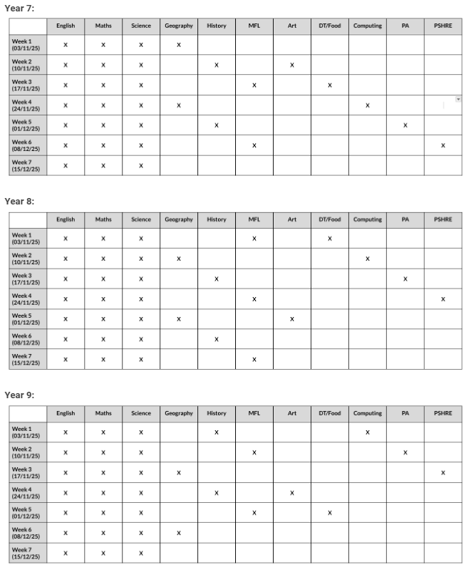 The specific timetable for your child’s year group has been inserted below: An ‘X’ marks where your child will be set homework for that subject in that week, for example a year 7 student will be set homework for English, Maths, Science and Geography in week 1 of module 2. For years 10 and 11, where it states ‘Cycle 1’ etc. students will be set 1 piece of homework during that two week period.