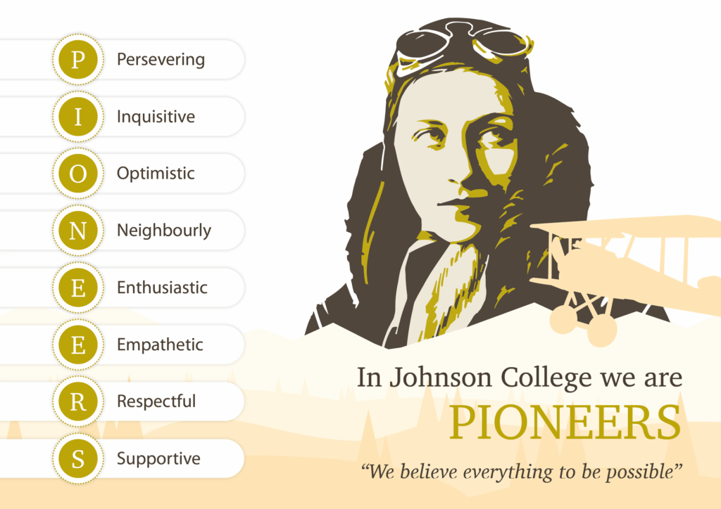 The Johnson College key values are linked to one of Amy Johnson’s key attributes as being a PIONEERS.